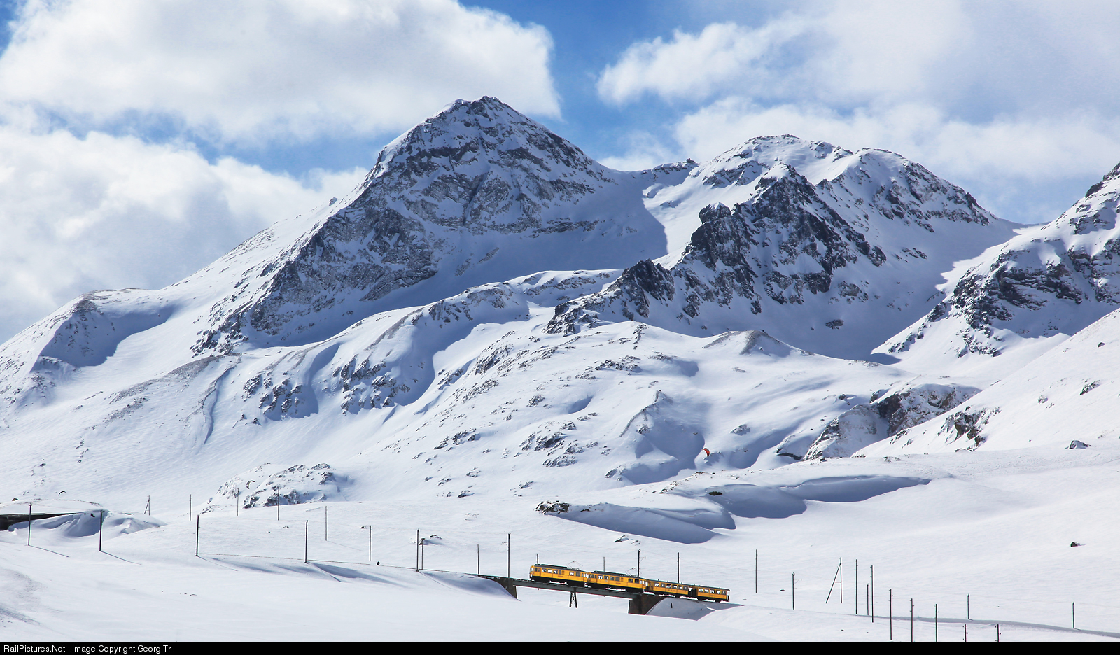 | "Yellow train" in the original colors of the former independent "Bernina Bahn" (since 1943 part of the Rhätische Bahn) is crossing upper Bernina creek bridge (Obere Berninabach Brücke), although called wild-west bridge, in the 7.0 % ascent to the Bernina pass, with 3031 meter high Piz Sassal Masone mountain in the background. Railcars ABe 4/4 # 34 and # 30 from 1908/1911 are pulling BC 110 and C 114. |