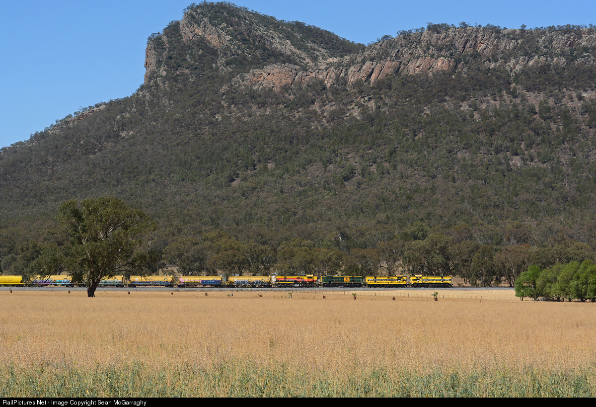 | The SSR branchline locos 4917, 4904, 4908 & 4911 combine to haul 1341N empty Westons grain train from Enfield to Boree Creek. The train has just departed the townsite of The Rock and is seen passing the landmark that the town is named after. |