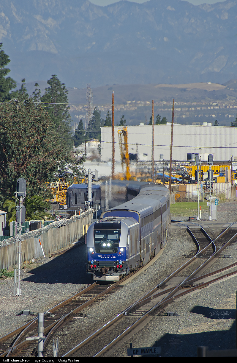Amtrak Pacific Surfliner 566 heads south through CP Maple in the city of Orange, California, on December 20, 2019. CP Maple is where Metrolink’s Olive Sub diverges from their Orange Sub – The Olive Subs tracks can be seen on the right, splitting off at the two switches. Eight-car train 566, with SC-44 2115 up front and another SC-44 (CDTX 2122) on the rear, is heading from Los Angeles to San Diego. (The seagull atop the tall pole has a great view.)