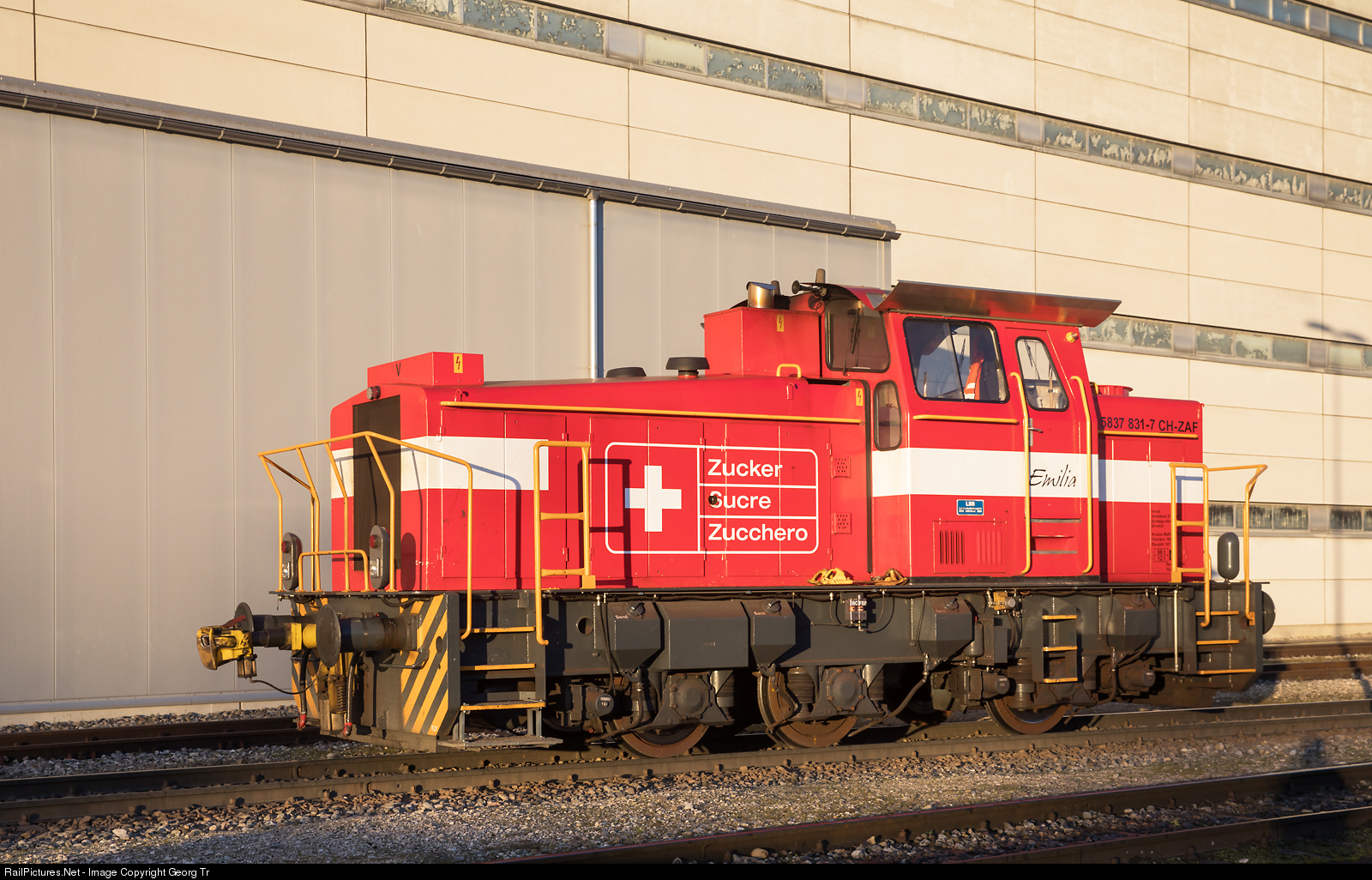 Three-axle Krauss Maffei M700C diesellocomotive "Emilia" of the sugar works Frauenfeld, built in 1973 for the RAG (Ruhrkohle AG, BAG Niederrhein) as "V 101". Refurbished by LSB AG (Lok Service Balmer AG) in 2015. The 66-tonne locomotive with UIC number 98 85 5837 # 831-7 CH-ZAF was re-motorised and equipped with a Deutz V8 engine with 500 kW output. It now has a particle filter (full-flow burner with active regeneration), a revised compressor with new hydrostatic drive and a modern central pneumatic control system including skid and wheel slide protection. Among other things, the Voith transmission was also overhauled. The vehicle was completely repainted and the driver's cab was refurbished. The locomotive is equipped with a BSI 900 shunting coupling and can be operated by radio remote control.