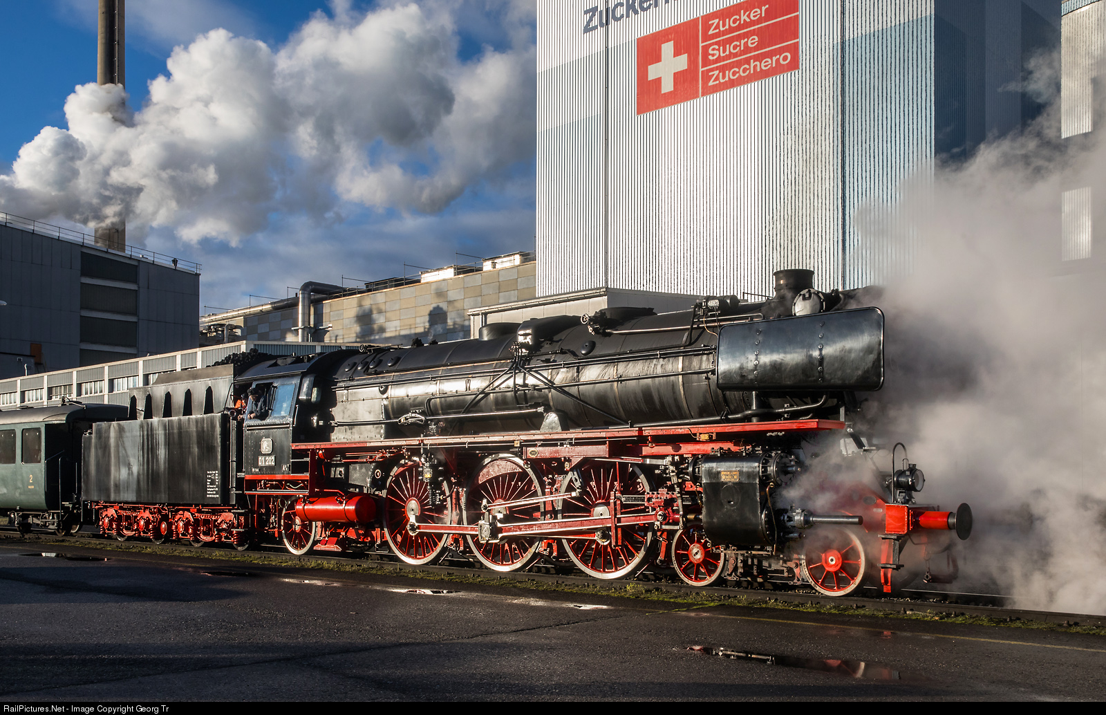 | The 4-6-2 "Pacific" express train steamlocomotive 01 # 202 of the former Deutsche Bundesbahn, now based in Lyss/BE, is shunting in the yard of the Schweizer Zucker (Swiss sugar works) in Frauenfeld. The locomotive pulled a 300 meter long "photo" freight train this day from Aarberg to Frauenfeld, to celebrate the successful sugar beets campaign 2019 of the TR TransRail railway. |