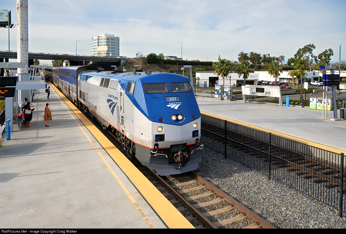 Amtrak’s highest-numbered P42DC, 207, arrives in Anaheim with Pacific Surfliner 744 from San Luis Obispo 25 minutes behind the advertised. This train consists of 7 cars, with CDTX SC-44 2110 on the rear. The late December holidays seem to have resulted in longer than usual trains on the Surfliners. (Anaheim, California – December 20, 2019)