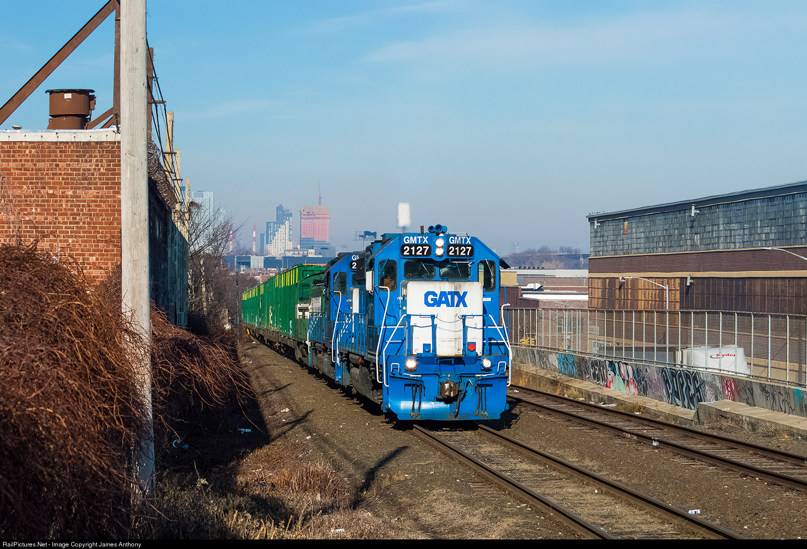 | New York & Atlantic Railway RS-90 is notched out as it climbs the Lower Montauk Branch Grade from the Waste Management Facility just outside of Long Island City Station in Queen's Section of New York City, once through here they'll under the Maspeth Warehouse Tunnel and head to Fresh Pond Yard to collect their cars from the Bushwick and take them upstairs to CSX and take the inbounds to their respective branches, in the background is part of the Manhattan Skyline. |