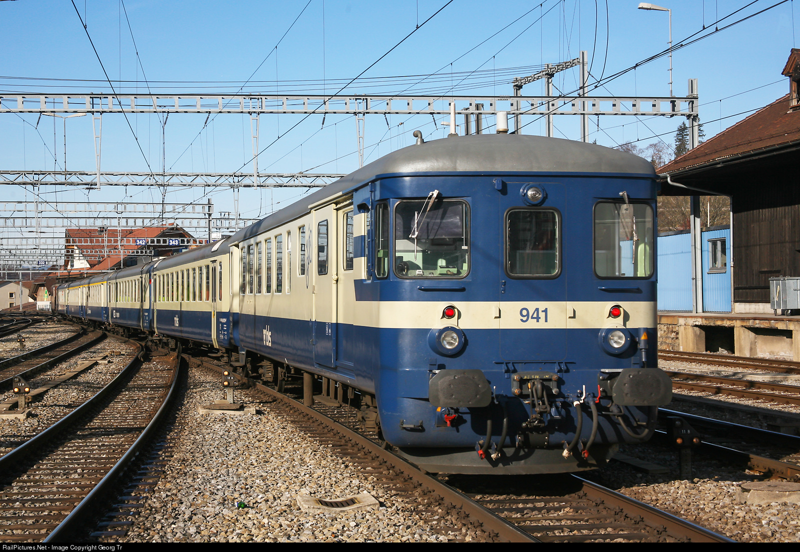 | Push-pull train of the BLS from Interlaken ost to Zweisimmen is leaving Spiez, with cab car BDti 941 in the rear and locomotive Re 4/4 # 190 pulling. The cab car dates from 1950 (built as third class car C4) and was rebuilt in 1980 and 2001 for this service. |