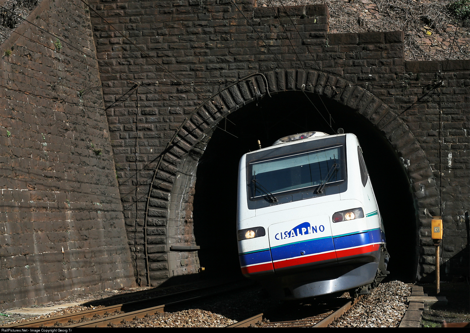 Highspeed tilting train ETR 470 # 004 of the Cisalpino is leaving the 1509 meter long Pianotondo helicoidal tunnel in the Biaschina on the Gotthard mountain line. The train is full tilted with 8 degree, running with 90 km/h through the 300 meter radius curve, instead of 80 km/h for other passenger trains or 75 km/h for freights. This is CIS 154 from Trieste via Milan to Zürich and Schaffhausen. Cisalpino had 9 of this ETR 470 trains, which were built by FIAT Ferroviaria (Alstom) in Savigliano. When the Cisalpino company was liquidated in december 2009, 4 of this trains came to the SBB, but were withdrawn and scrapped in 2014. One end car of a ETR 470 is preserved by SBB Historic and stabled in the shed of Erstfeld.