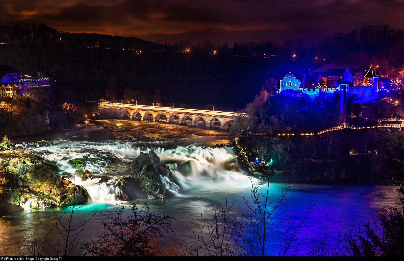 On christmas eve at 8.08 PM the S 12 service 19273 of the SBB from Brugg (AG) via Zürich-Winterthur to Schaffhausen, a doubledeck commuter train with locomotive Re 450, is crossing the 177 meter long bridge above the Rhine falls, between the bluish illuminated castle Laufen and Neuhausen. The bridge of the line Winterthur-Andelfingen-Schaffhausen was built in 1856. In the moment, about 382 m3 (or 100'000 gallons) water per second are falling down 23 meter and forming the 150 meter wide Rhine falls. The flow of water is slightly over the average in the moment.