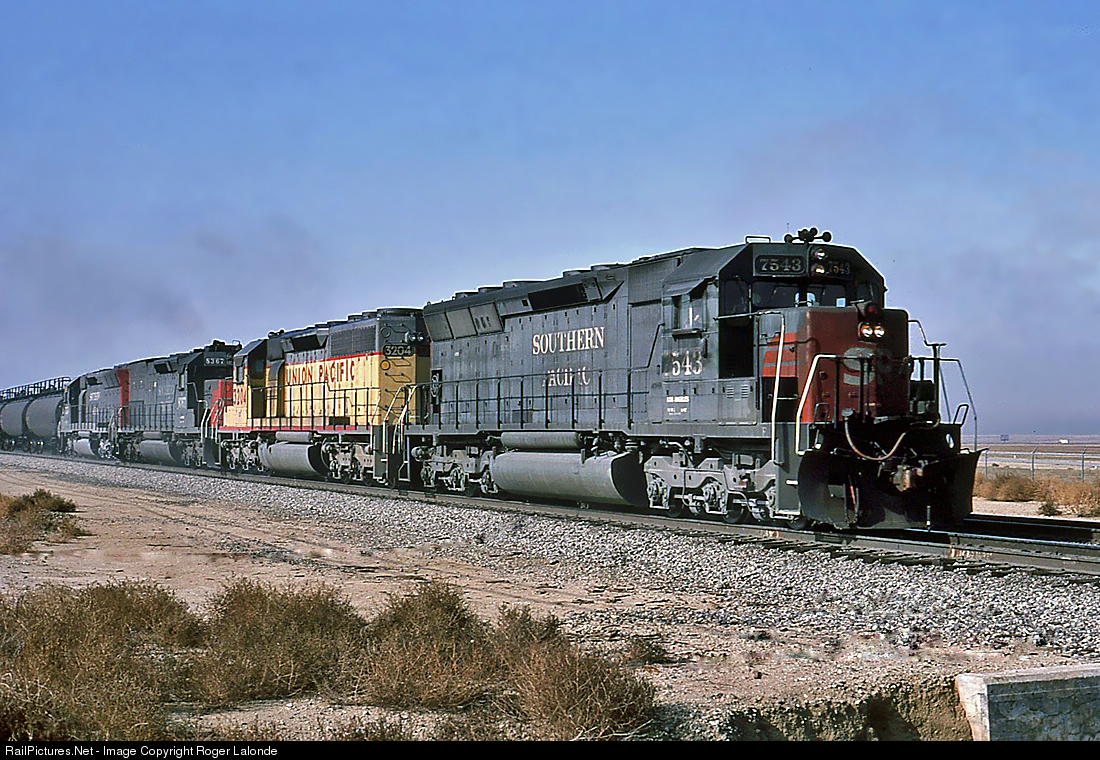 | Southern Pacific tank-train with units, SP SD45R 7543, UP SD40-2 3204, SP SD40T-2 8367 and SD45R 7642 southbound near Mojave, California. |