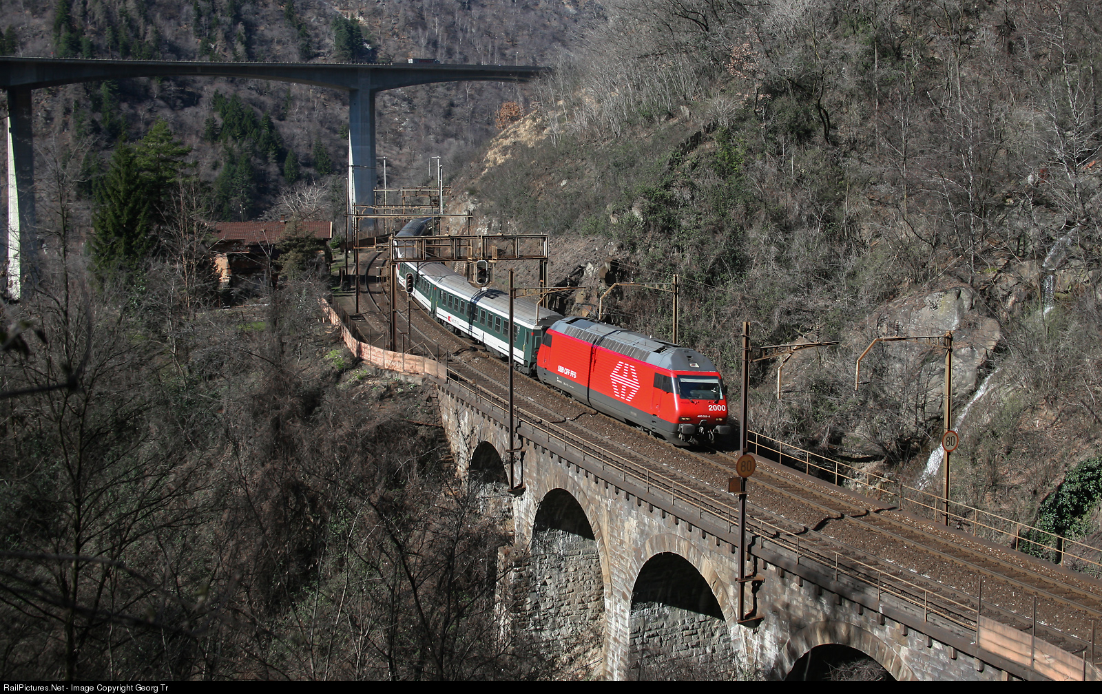 | Re 460 # 008 of the SBB is pulling the Interregio 2267 from Zürich to Locarno over the 40 meter long Travi viaduct on the middle level of the Biaschina "staircase". A rather hidden point on the Gotthard mountain line. |