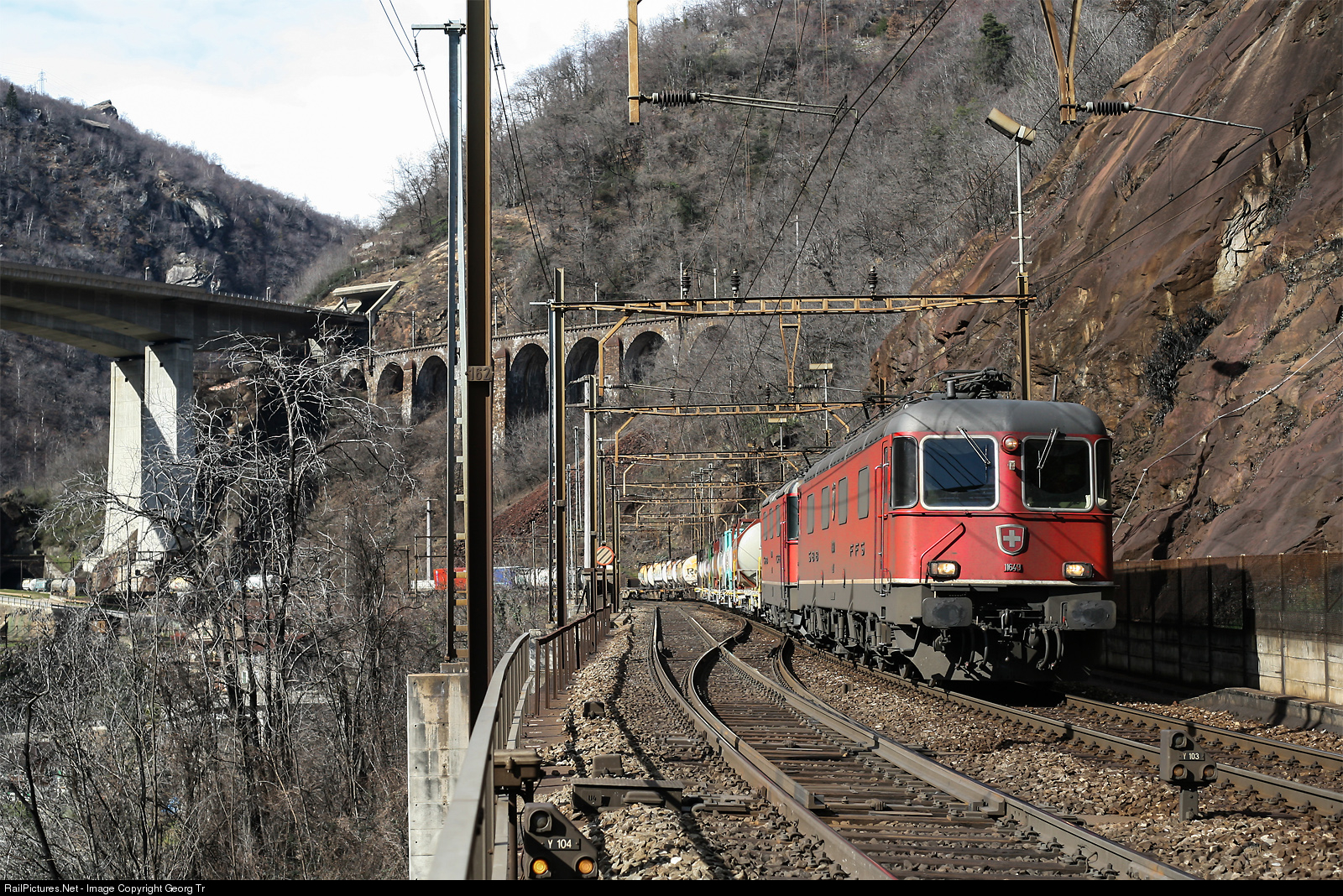 | Re 6/6 # 11649 and an unknown Re 4/4 II in multiple traction are pulling a southbound intermodal freight on the middle level of the Biaschina staircase. In the background the 104 meter long Pianotondo viaduct on the uppermost level. |