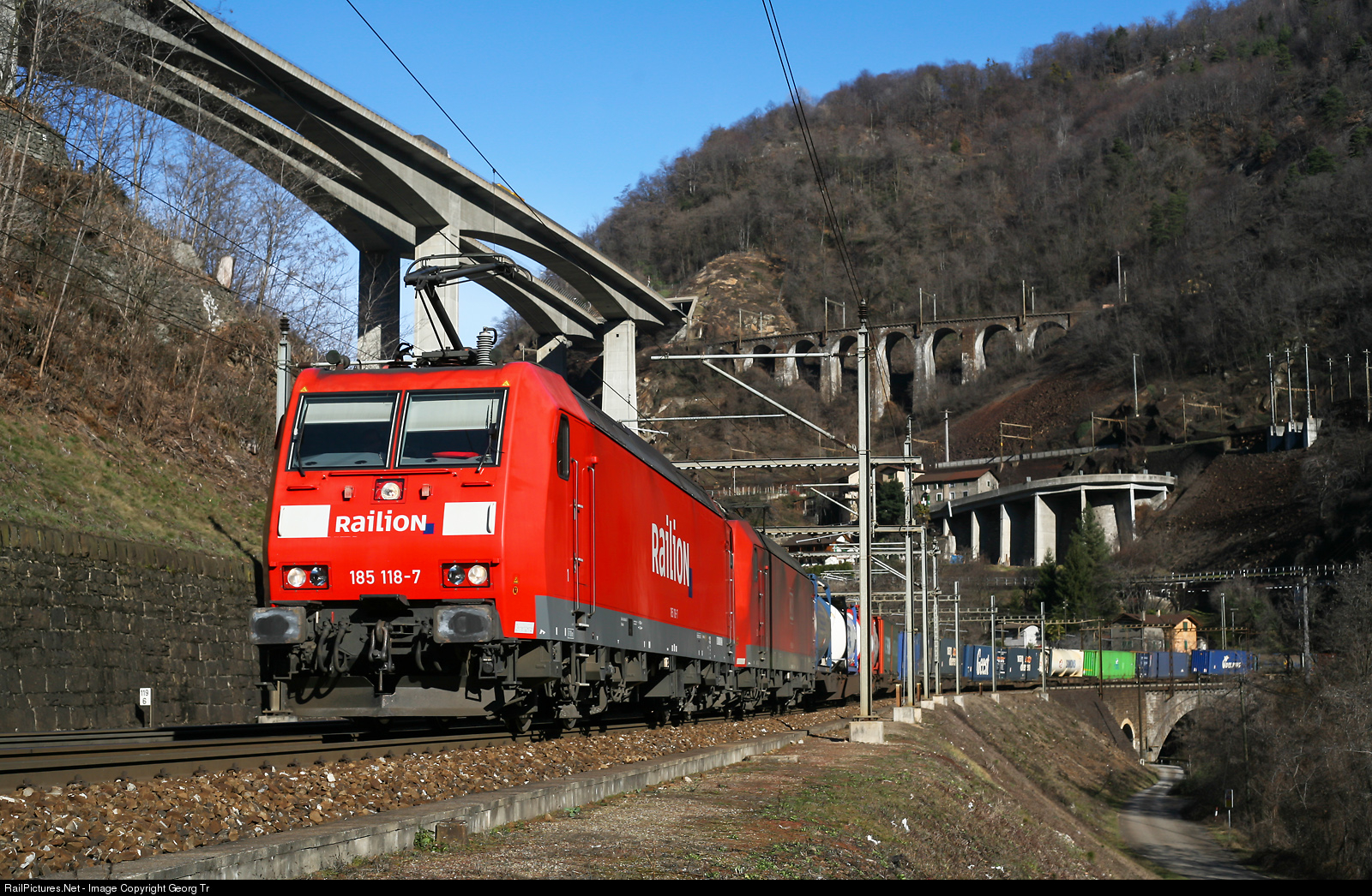 | Locomotive 185 # 118 and another of the same series of Railion (which was the name of the Cargo division of the Deutsche Bahn between 2003 and 2009, afterwards it was DB Schenker Rail) are pulling a southbound intermodal train through the staircase of the Biaschina, with the middle and the upper level in the background. On the left the viaduct of the motorway A2. |