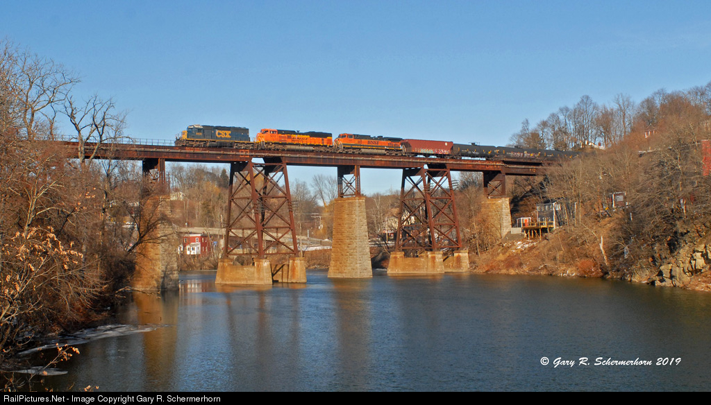 | A nice Christmas Eve “gift” from CSXT & the Train Gods on a milder blue dome day in the Hudson River Valley. A former B&O war wagon CSXT 8435 leads two BNSF units over the Catskill Creek just shy of noon. I saw the moving tank cars of this beast on my way up to shoot any potential goodies at Selkirk going by QR-126 and immediately did a sharp U-Turn. The crew had basically the River Sub all to themselves and clear greens all the way south to CP-3. |
