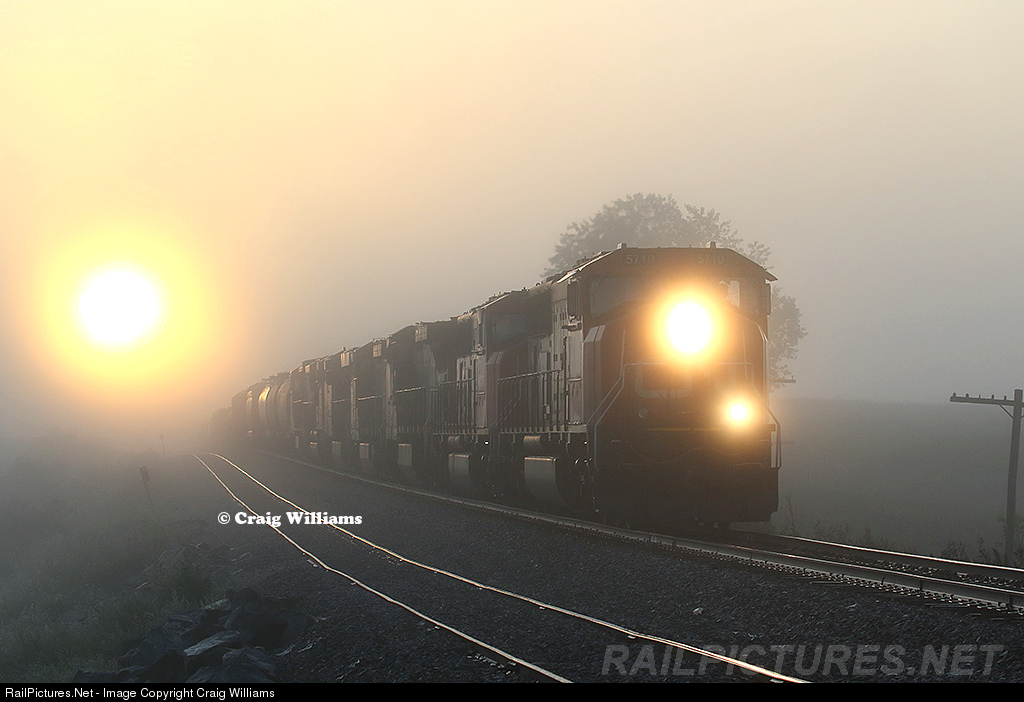 With 7 motors and over 10,000 feet of traffic for Iowa, this daily Kirk Yard to Waterloo manifest rumbles by the last siding before Waterloo at Jesup. The train is about 16 miles from destination. Normally this train would arrived at Waterloo in the early morning hours, but sometimes late departures from Chicago or problems enroute will make it a daylight train before Waterloo. The sun is trying hard to burn thru the fog, otherwise this would have been a great sunrise photo down the tracks!