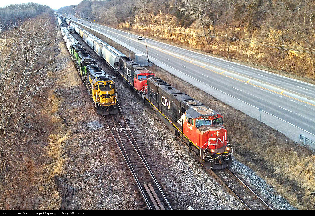 | CN's daily Waterloo to Kirk Yard manifest train accelerating out of East Dubuque and passing the BNSF CHI812 local at Murphy. The CN runs 12 miles over the BNSF Aurora Sub from East Dubuque to Portage. The BNSF local has just finished setting out a car to the center siding for the CN here at Murphy. |