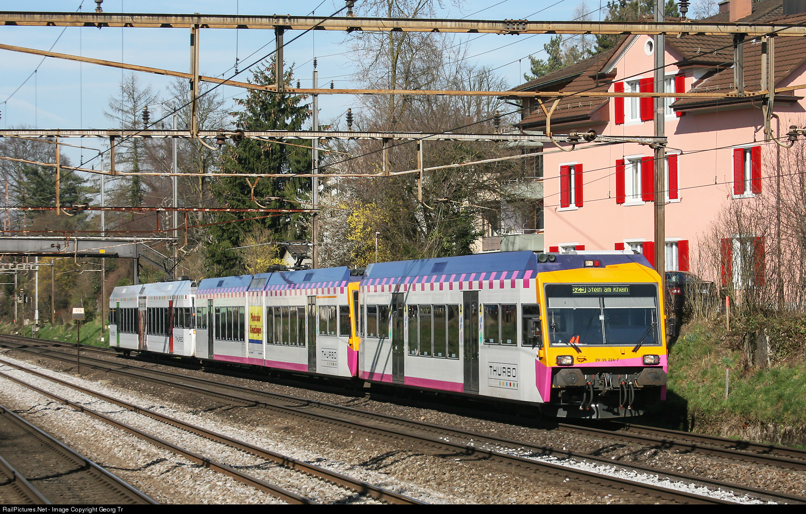 | Train of the S 29 from Winterthur to Stein am Rhein of the Thurbo, with articulated lowfloor regional trains of the first generation (former Mittel-Thurgau-Bahn). Leading is cab car Bt # 224, followed by two RABe 526 # 68., one in the orange/lila paint scheme of the former Mittel-Thurgau-Bahn, one in the new light grey of the THURBO with the coloured "Thurbogons" on the roof edge. |
