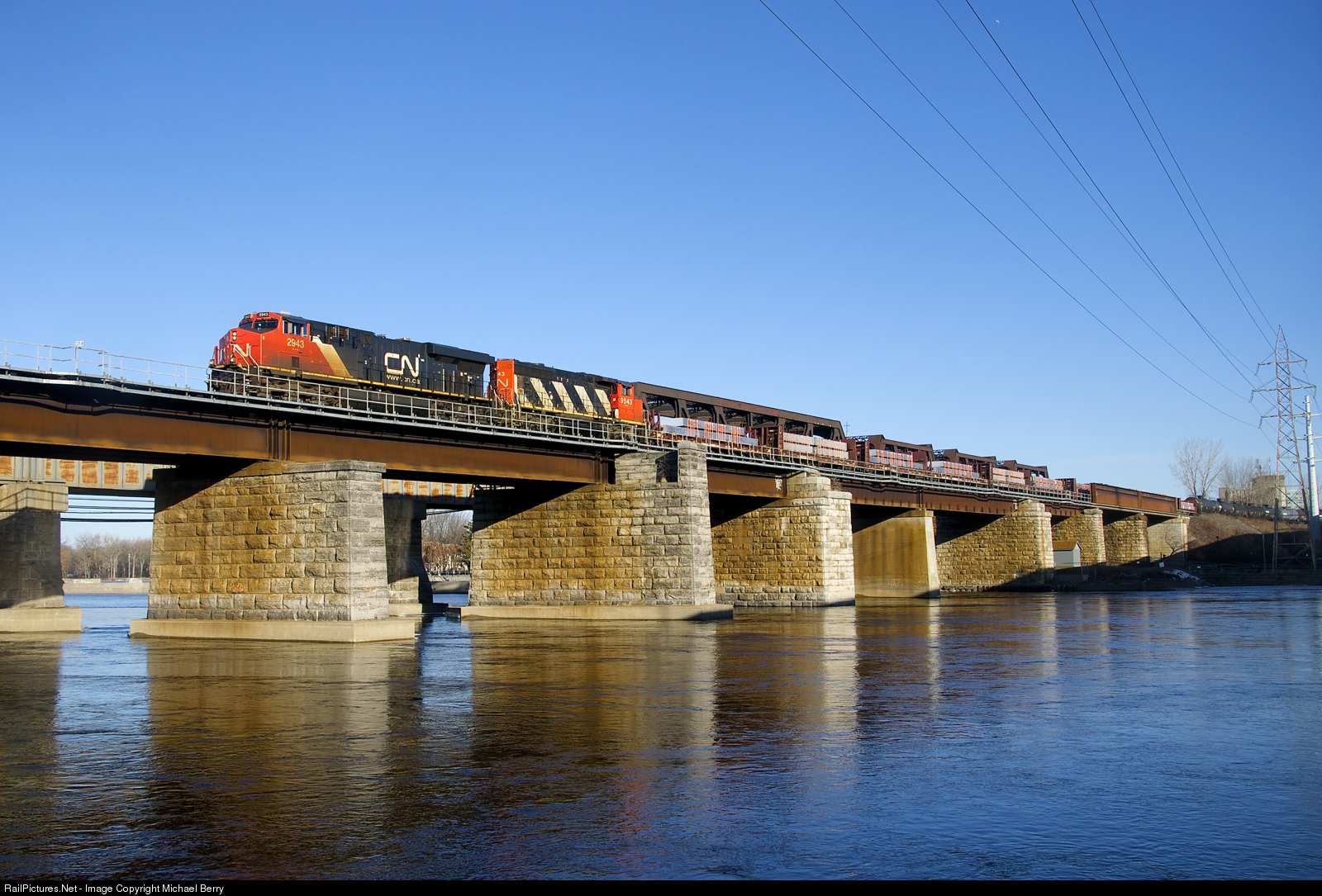 CN 369 has CN 2943 & CN 9543 up front (and CN 2806 mid-train) as it crosses the Ottawa River with ingots of aluminum up front. CN 9543 will be set off at Brockville.
