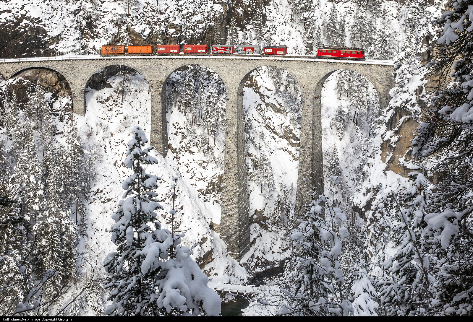 Ge 6/6 II # 701 "Rätia" is pulling freight 5135 from Landquart to Pontresina over the 65 meter high Landwasser viaduct between Surava and Filisur. The locomotive is 61 years in service now.