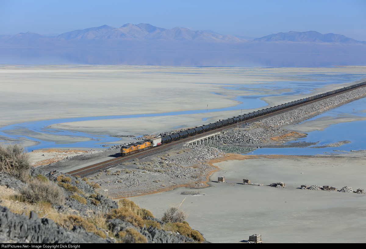 | UP 8961 has finally got its feet dry on solid land at Lakeside, Utah. The past 32 miles from Little Mountain have been “at sea” crossing the Great Salt Lake. Except for 3 miles of dry land at Promontory Point the entire distance is either over salt water or mud as seen here. This is a solid unit train of ethanol headed west. |