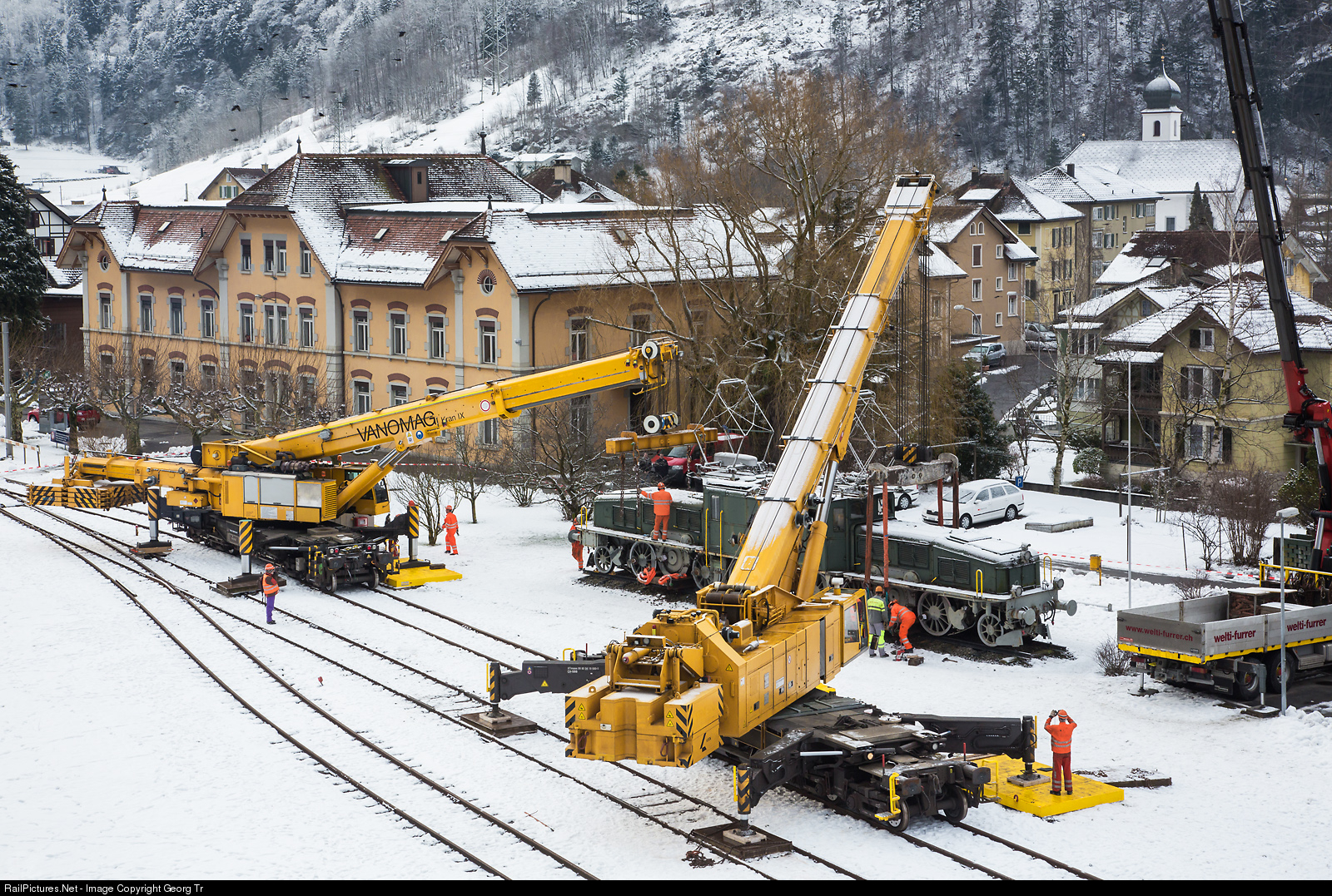 In january 2013, the "Crocodile" Ce 6/8 II # 14270, which was exhibited in Erstfeld on a short piece of track since 1982, was put back on the tracks by two large railway cranes and then temporarily stored in the old steam engine shed. A first attempt to lift the "crocodile" at 10.30 AM failed, because the locomotive was moving around its longitudinal axis. The mounting on the crane had to be done in a different way and the action was successfully then after 01 PM. Locomotive Ce 6/8 II # 14270 left the position, where it stand for more then 30 years. On the right KIROW KRC 1200 of the SBB for up to 150 tons, on the left "Kran IX" of Vanomag company, a Gottwald product for up to 130 tons.