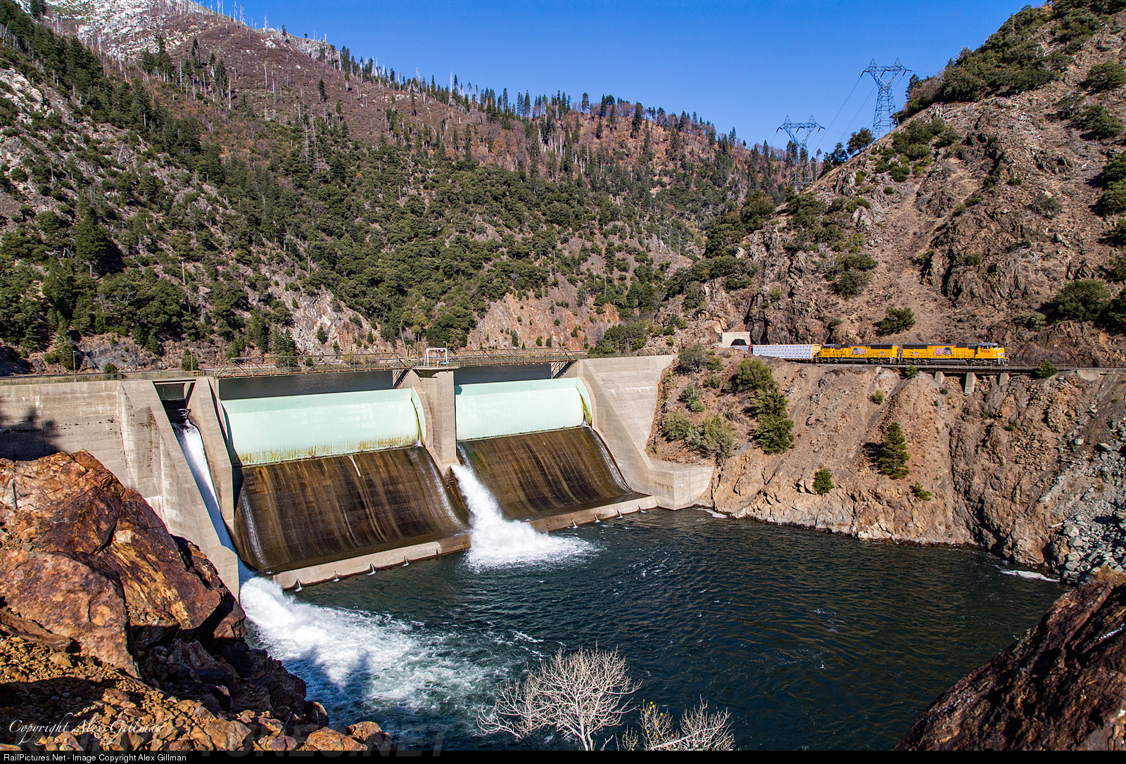 UP 9926 finds the morning light in the depths of the Feather River Canyon for the first time today as it leaves the Honeymoon Tunnels behind and passes the Rock Creek Dam - a popular focus point for railroad photographers to frame trains with.