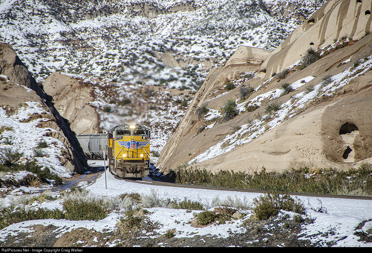 Union Pacific freight train M-NPWC2-22 passes through the iconic Mormon Rocks, dusted with snow, as it ticks off the last few miles of its journey from North Platte, Nebraska, to West Colton Yard, just 25 miles ahead. But first, this train will take the siding at Canyon (on UP’s Mojave Subdivision) to meet a northbound train intermodal train. UP SD70ACe 8610, SD70ACe 8524 and AC4400CW 7285 (with ES44AC 8030 and AC4400CW 6539 pulling duty as the rear DPUs) on this train. In the last 1960s, Southern Pacific built this railroad (dubbed the Palmdale Cutoff) to allow trains to bypass congested Los Angeles, and their surveyors found a narrow route through these historic sandstone blocks, exposed to the elements through plate tectonics due to the nearby San Andreas Fault. The rocks received their name from Mormon settlers, moving to the Los Angeles Basin from Salt Lake City UT. (Cajon Pass, California – December 27, 2019)