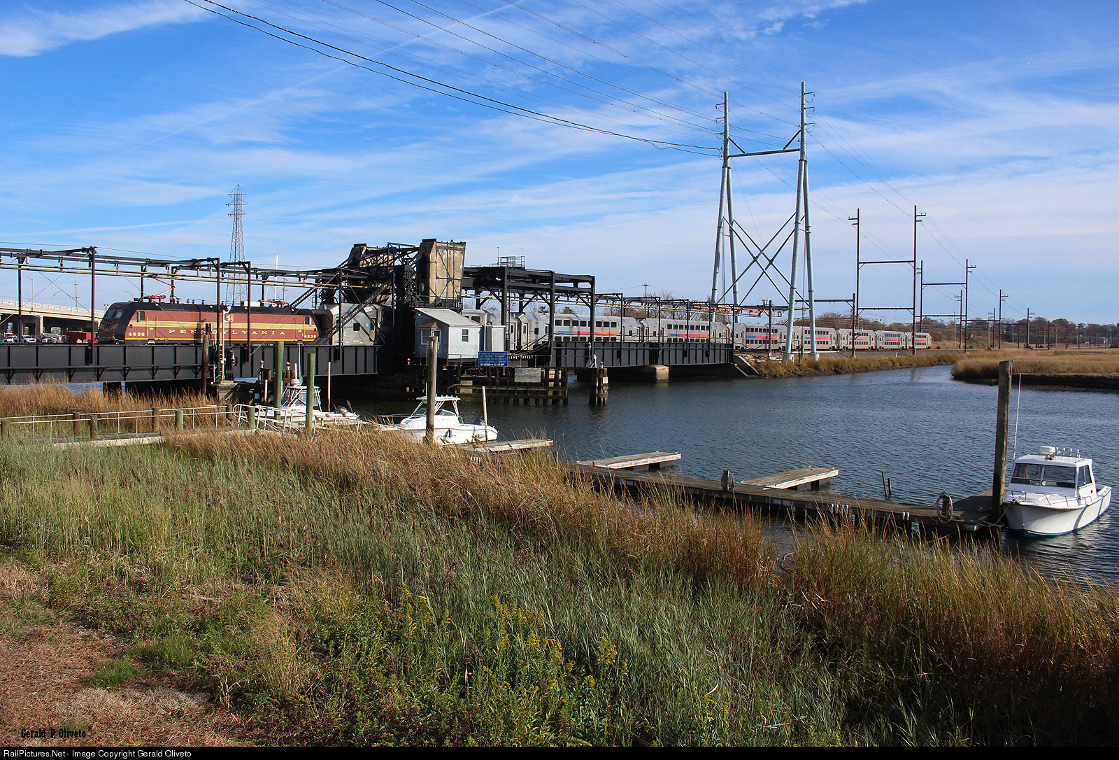 NJ Transit ALP46A no. 4636 in Pennsylvania Railroad livery heads west across Morgan Drawbridge spanning the Cheesequake Creek. Jointly owned by the Pennsylvania Railroad and the Central Railroad of New Jersey, these tracks were not electrified until 1982; prior to which an engine change from electric to steam or diesel would have occurred at South Amboy. A Pennsylvania Railroad electric locomotive under wires west of South Amboy is uncharted territory for the "Standard Railroad of the World."