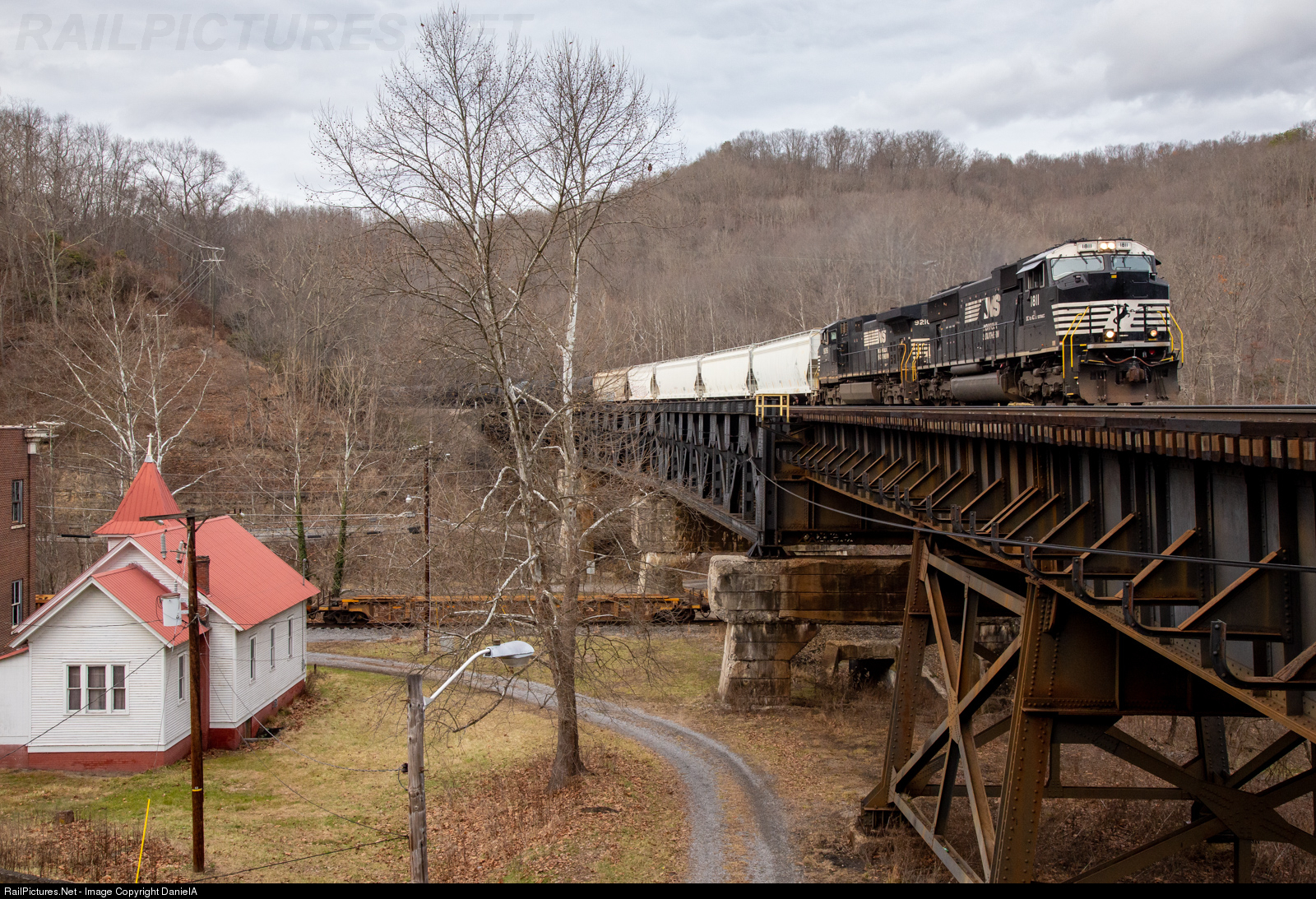 | NS 194, with an SD70ACC leader, crosses over the massive trestle in Bramwell, Wv on the "Pokey". |