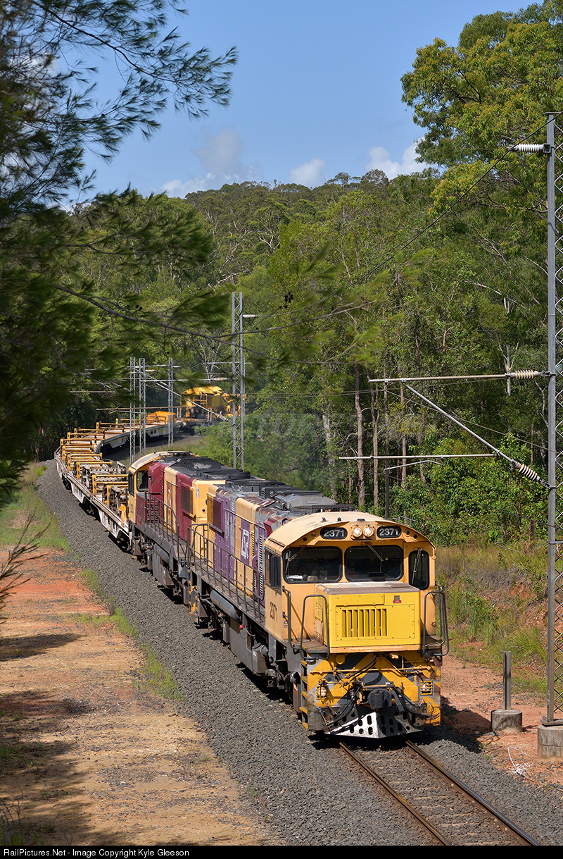 | 2371 and 2353 notch up on the northern end of Cooran leading 7752 Townsville to Acacia Ridge Sweeper hauling the lobster railset. 1/01/20 |