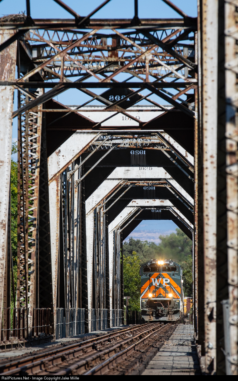 | Originally constructed in 1898, with new spans added in 1929, the Sacramento River Bridge at Tehama has long been an important link for trains coming to and from Northern California. The bridge spans over 600' and is the only railroad crossing of the Sacramento River between Redding and Sacramento. In this shot, Union Pacific 1983 is on the point of a 111-car manifest as it approaches the Sacramento River Bridge. |