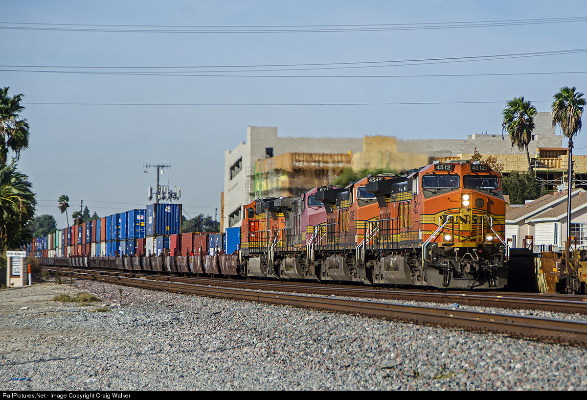 Heading east through Fullerton, California, is BNSF Railway train S-LHGCLO1-16 (Intermodal Stacks; Los Angeles Harbor CA [GGS] to Clovis NM). A solid set of four Dash 9-44CWs is powering this train: 4512, 4545, 671 (ex-ATSF 671) and 5261. (December 17, 2019)