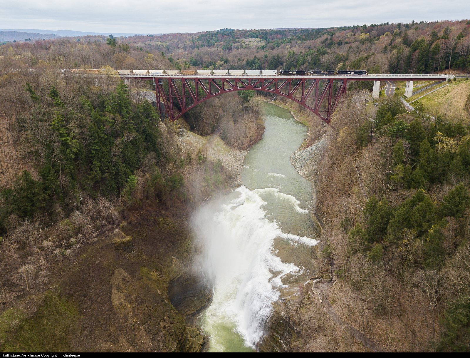 | Norfolk Southern freight 309 soars across the Genesee River through Letchworth State Park behind an SD80MAC, C44-9W, and SD70ACe. The Genesee Arch Bridge was opened in 2017 to replace the 1875 built trestle, allowing for increased train speeds and car weights. The Upper Falls of the Genesee River drop 70 feet just downstream of the bridge. |