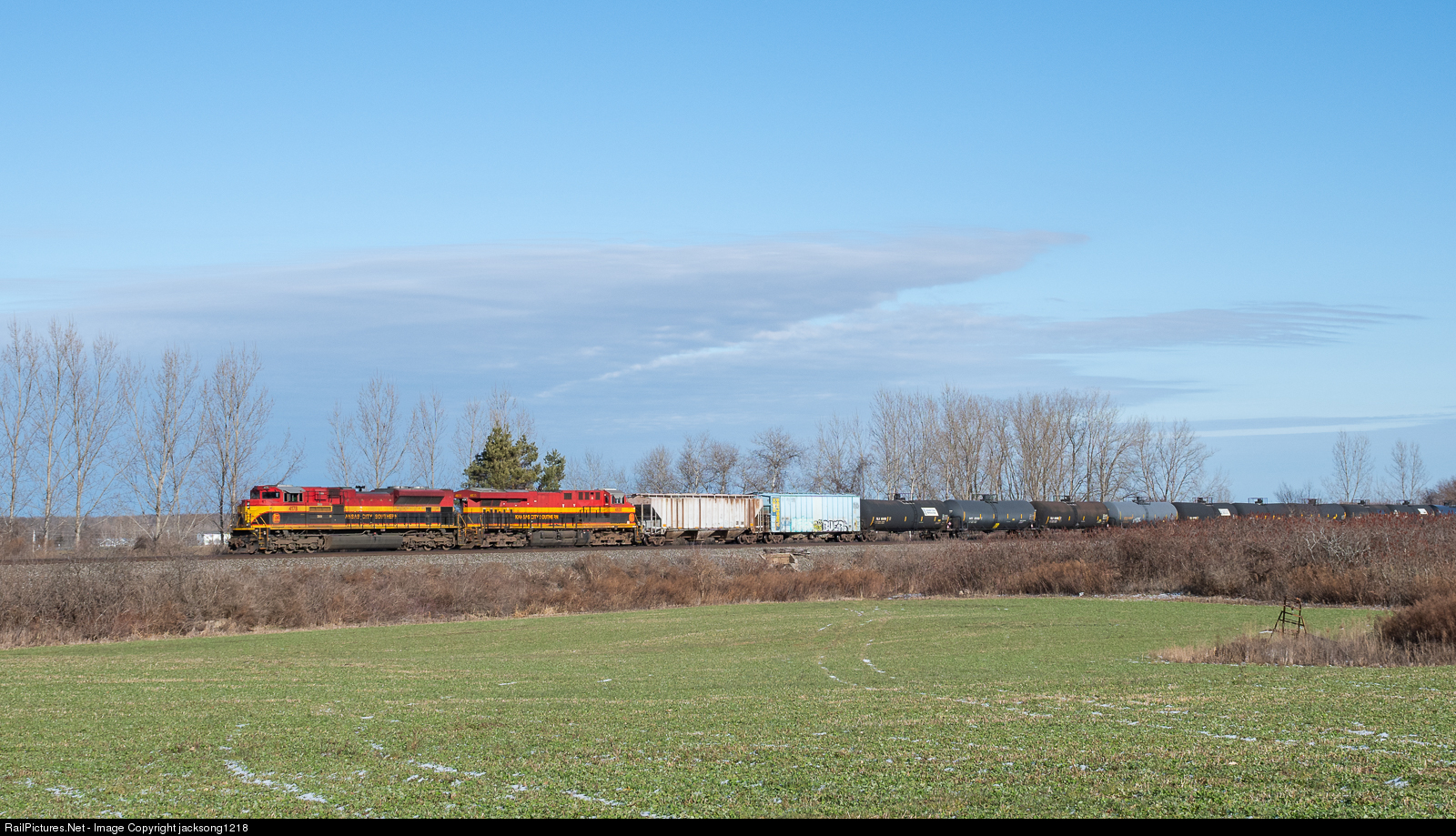 A duo of Kansas City Southern locomotives in the "Southern Belle" paint scheme are in charge of an empty CSX tanker train, symbol K635, as it passes through the farm fields of Bergen, NY.