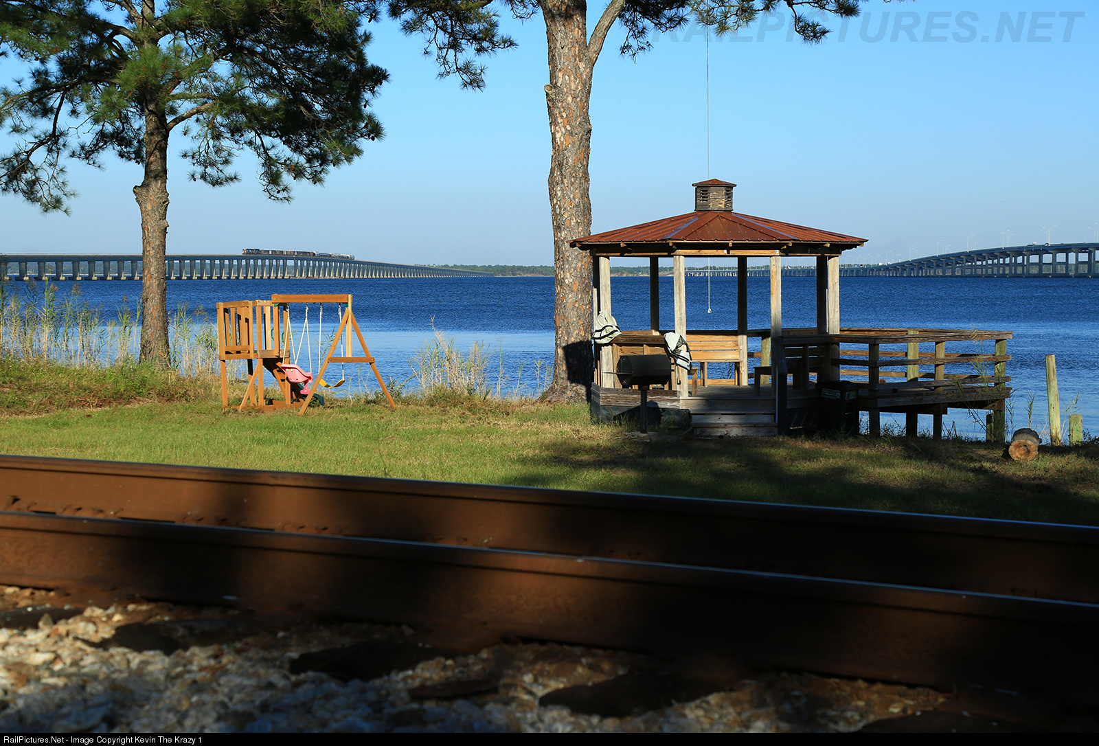 A westbound Florida, Gulf & Atlantic train crosses the 11,648ft long bridge spanning Escambia Bay into Pensacola, FL.