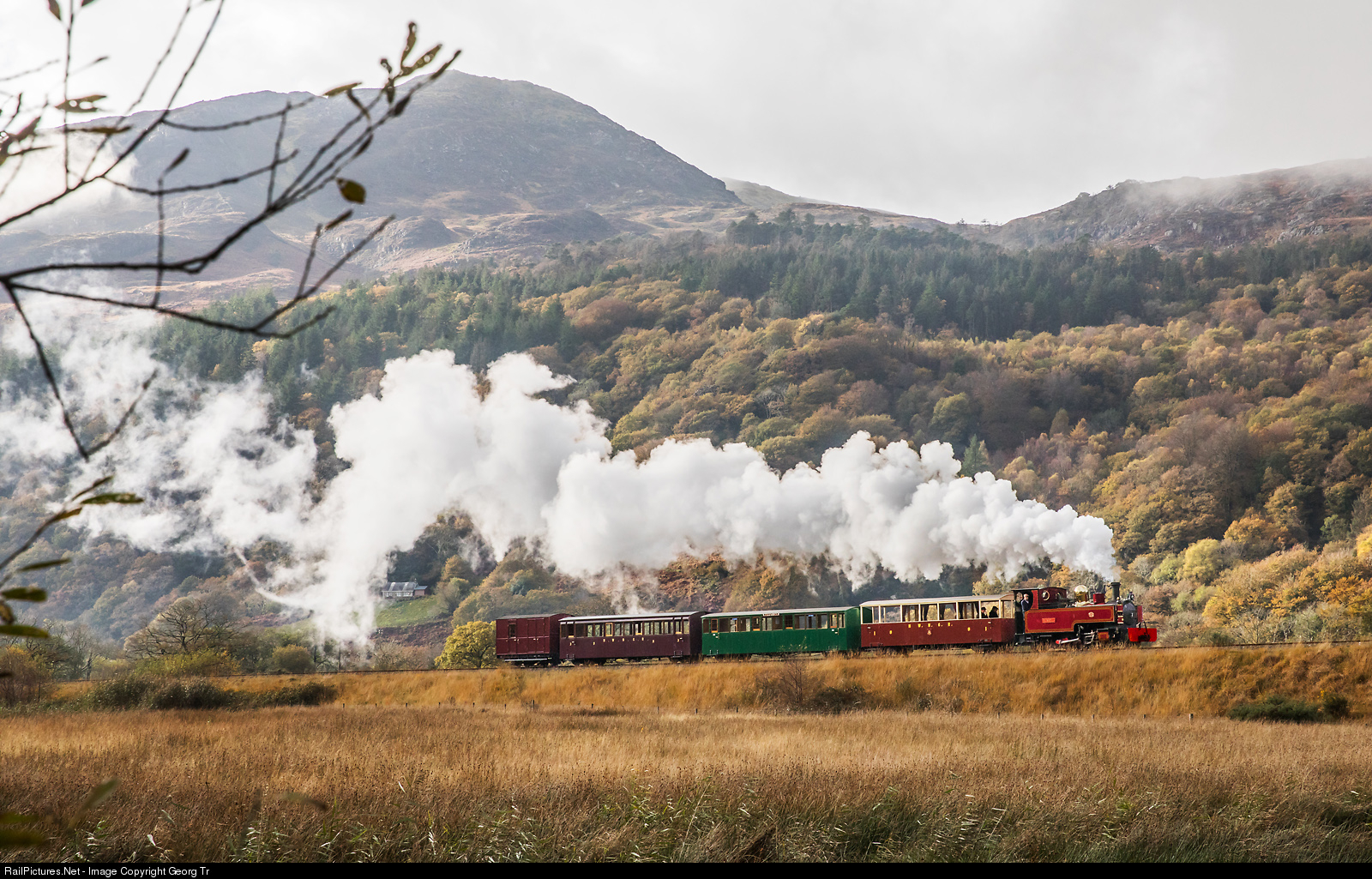 | 2-6-2 T steamlocomotive "Russell" of the Welsh Highland Heritage Railway (WHHR) in Portmadog is pulling a photo charter train on the Welsh Highland Railway (WHR) between Pont Croesor and Nantmor. This locomotive was built in 1906 for the North Wales Narrow Gauge Railways (NWNGR) by the Hunslet Engine Company and was named after the Chairman, Managing Director and second receiver of that company. In 1922 it became the property of the WHR along with the NWNGR. 1937 the WHR closed, with Russell running the last through train. After a very interesting history the "Russell" is operational again since 2013 for the Welsh Highland Heritage Railway, but is usually circulating on the about 1 mile long track of this railway only. |
