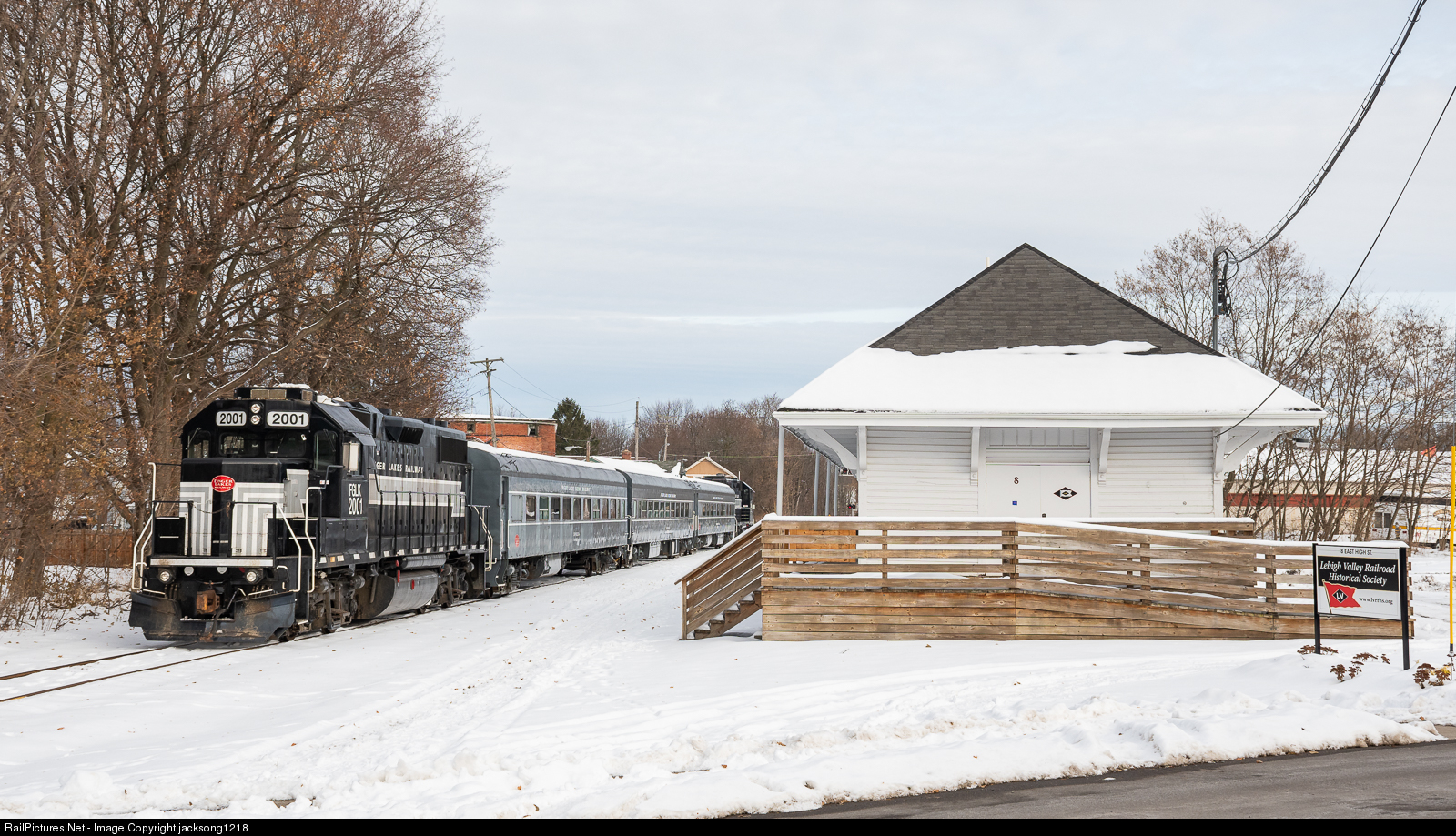 On December 8th, 2019, the Finger Lakes Railway ran excursions using three of their coaches and two GP38-2s from Canandugia, NY to Shortsville, NY. The train is seen here passing the Lehigh Valley Railroad Historical Societies building in downtown Shortsville, NY.