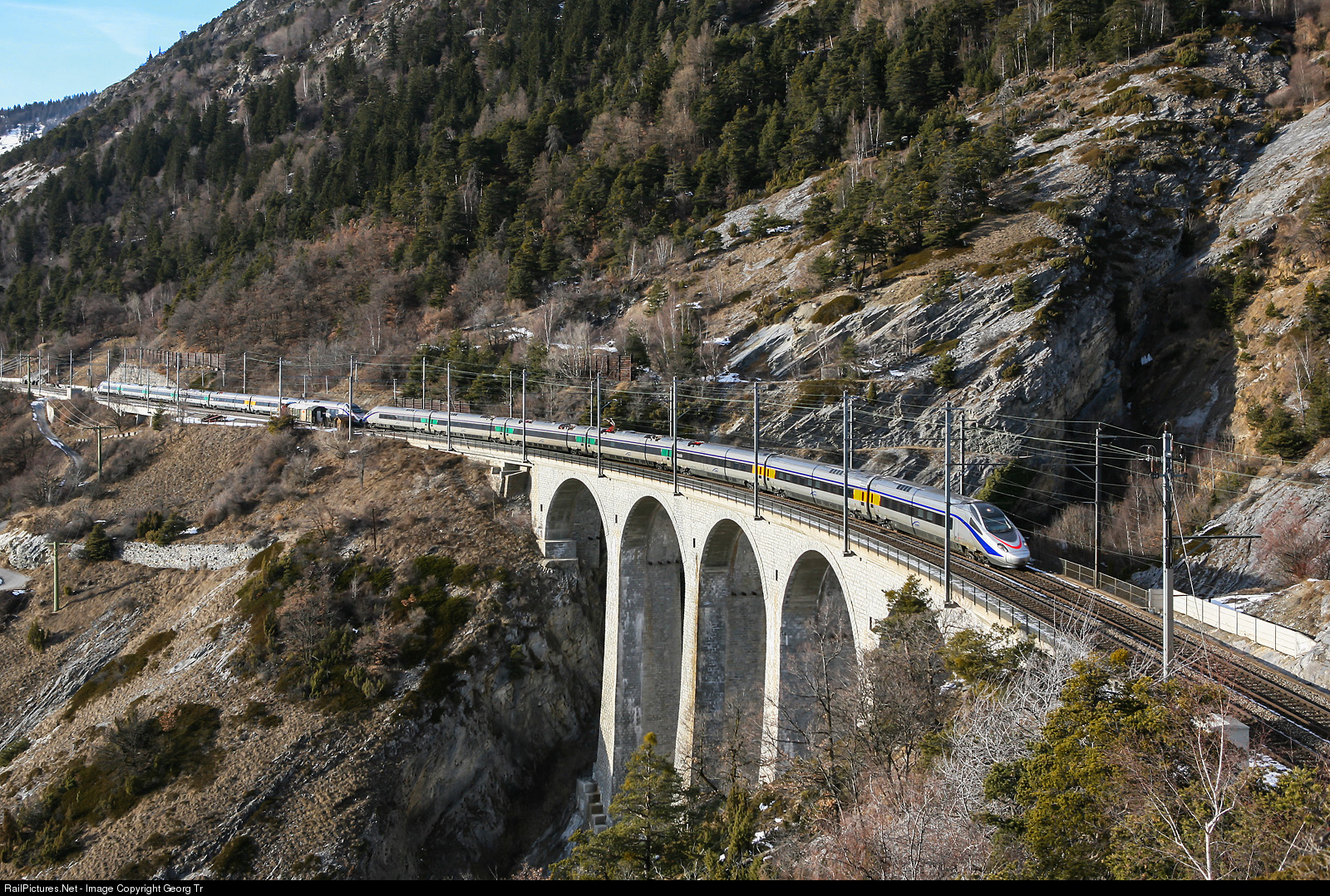 On the Lötschberg mountain line, where this trains never ran in regular service, two highspeed tilting trains ETR 610 of Cisalpino were on a test run, crossing the 55 meter high Luogelkin viaduct near Hohtenn. ETR 610 # 008 and # 010 are running in multiple traction. The Cisalpino company was terminated in december 2009 and the ETR 610 trains came to the SBB and Trenitalia.