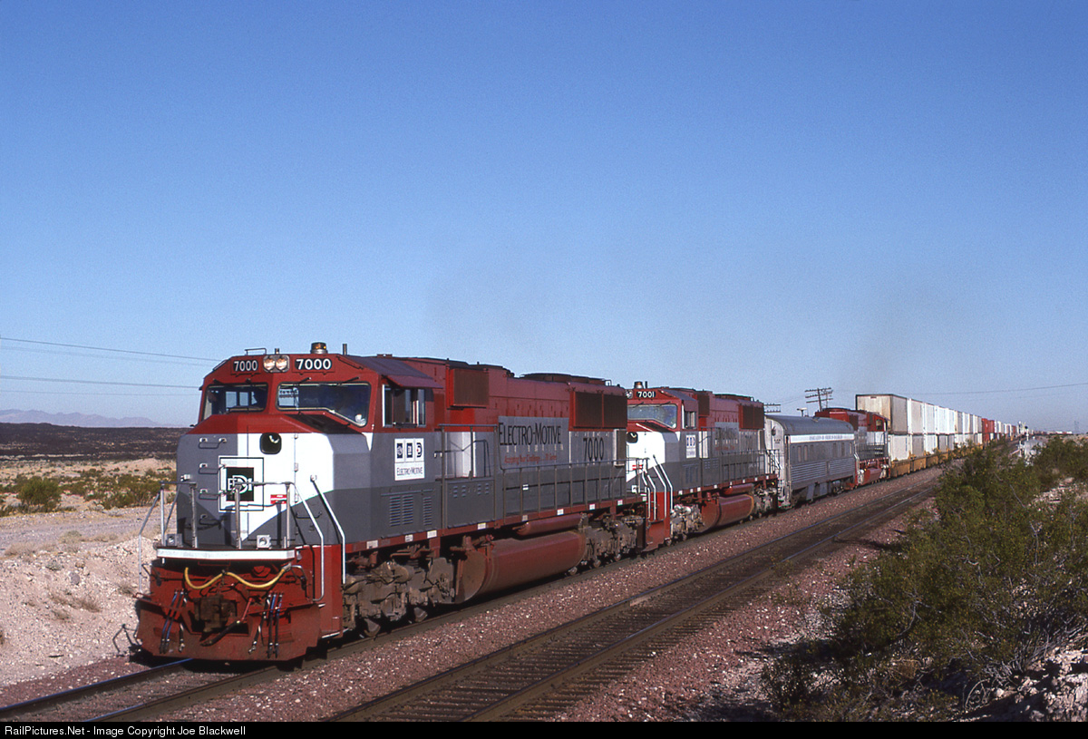 In OCT '93, a trio of EMD demos were testing on Santa Fe leading Los Angeles to Chicago stack train SLACH east through Pisgah, CA.