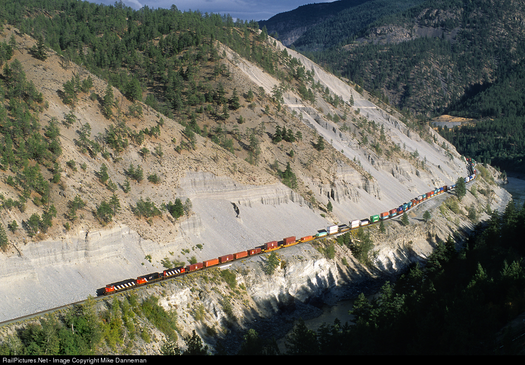 On September 28, 2001, a westbound Canadian National intermodal train follows the Thompson River east of Lytton, British Columbia, in a view from a scenic overlook in Skihist Provincial Park. Powering the train is EMD SD50F No. 5436 leading two SD40-2Ws.