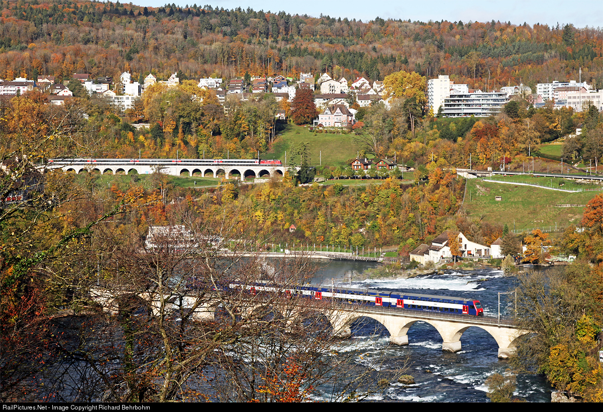 | On the bridge is a double deck commuter trainset (DPZ) of the S-Bahn Zürich. Behind on the line Zurich - Schaffhausen a Re 420 is pulling InterCity 380 to Singen. |