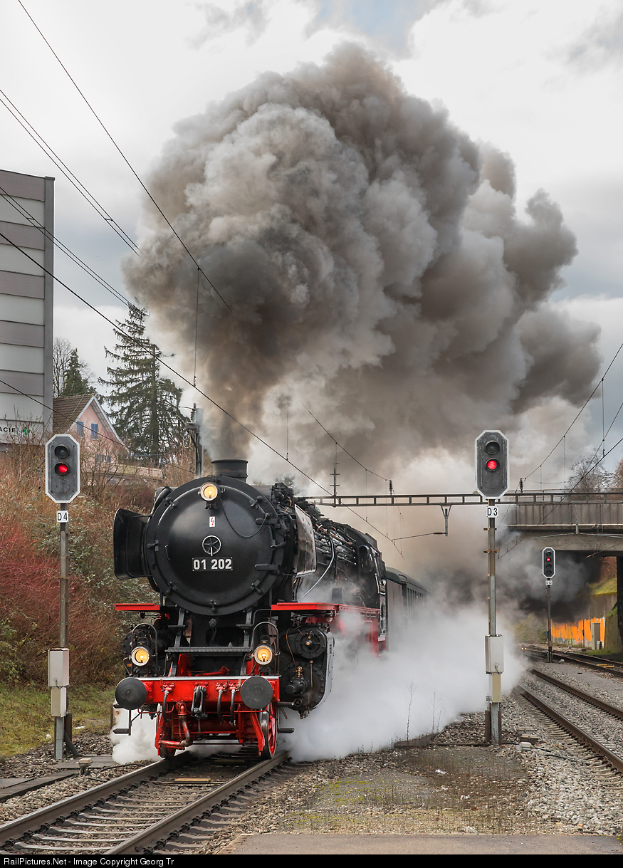 | To celebrate the successful 2019 sugar beet campaign of the TR TransRail railway, "Pacific" 4-6-2 steamlocomotive 01 # 202 from Lyss hauled a 300 metre long and 500 tonne empty container cars train (including a passenger car) from Aarberg to the Frauenfeld sugar factory (SZU Schweizer Zucker Werk Frauenfeld). The train is running with full speed through Kloten. |