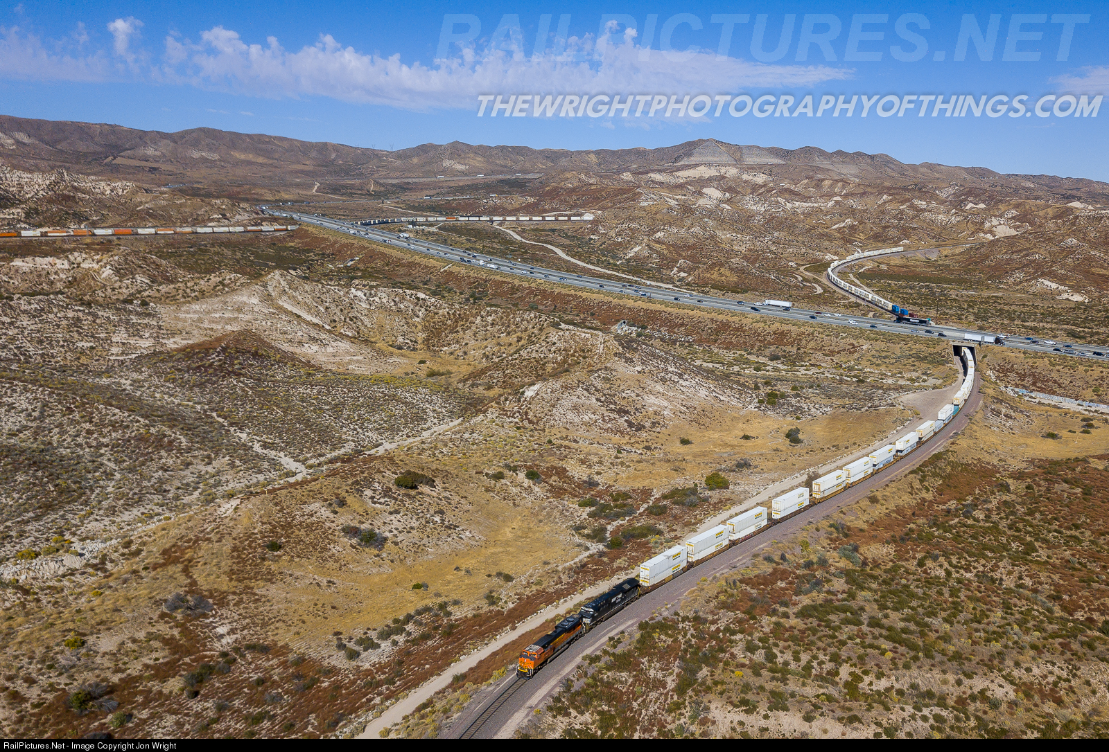 Gently gliding down the steady 3% grade is a westbound stack train on track 3 which encompasses most of the original mainline thru Cajon Pass passing over the remnants of Route 66 and under Interstate 15 while an eastbound works hard up the Pass at Alray.