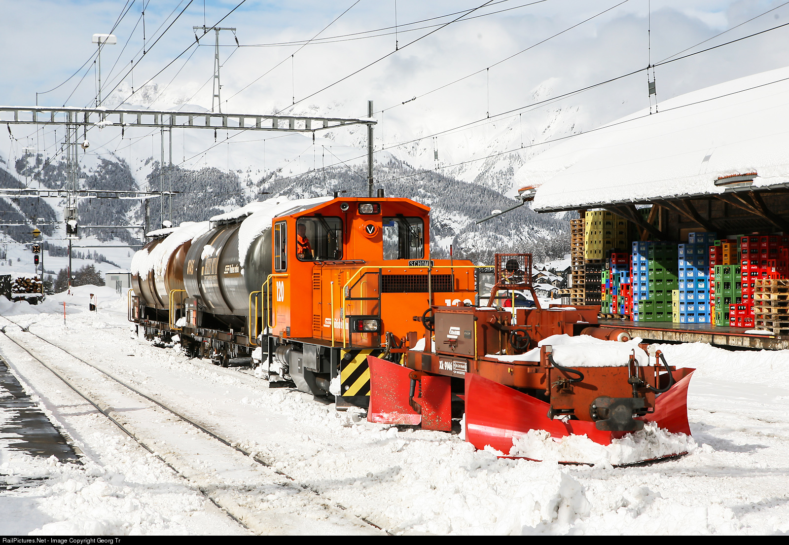 "Schöma" diesel shunter Tm 2/2 # 120 from 2006 with the flanger plow Xk # 9146 in Pontresina.