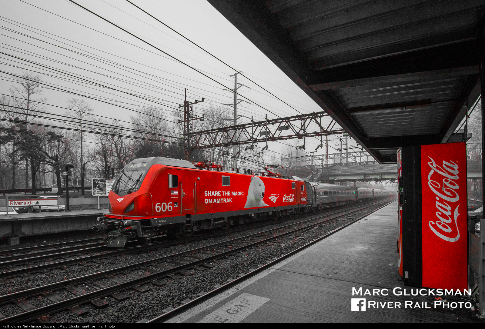 Signs of Coke Addiction. Do you find yourself checking your phone for where Amtrak 606 may be running everyday before you even brush your teeth in the morning? Thinking about where it will run the next day when you go to bed at night? You may be Coke addicted! Even your railfan friends can see signs taking a toll on you as the rest of the train world seems to have gone black and white. And if you’re over 30, you haven’t had anything except maybe a Diet Coke in a decade! On Saturday, January 5, 2020, Amtrak train 82 passes through the station in Riverside, CT, with a fitting offering of beverages on the CT DOT/Metro North platform.