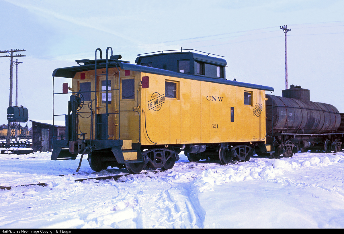 CNW 621, nicely repainted in the current (at the time) yellow and green scheme shows itself off in the snow at Altoona, WI yard. A careful look reveals "CGW" sub-letters under the number, making identifying this caboose on train lists a bit of a challenge. It was common to leave prior owner lettering on equipment acquired through mergers, but gets confusing with the larger CNW initials above the number. The number is not the normal CNW numbering, which were usually 5 digit numbers starting with "1".