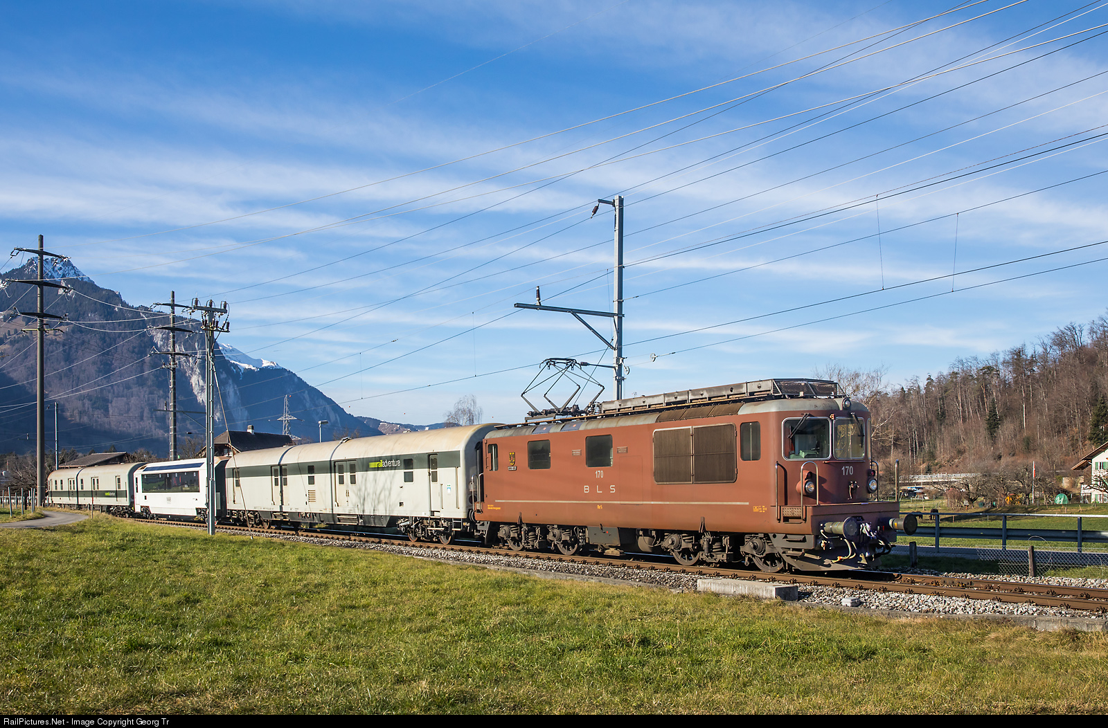 Transfer run from Zweisimmen to Spiez, in Lattigen bei Spiez. Re 425 # 170 of the BLS with coupling cars of RailAdventure (former mail cars of the Deutsche Bundesbahn) and the gauge-change car Bs # 221 of the MOB GoldenPass. The Bs # 221 has new developed bogies for 1 meter and standard gauge. In Zweisimmen, there is a gauge change device, were this new bogies can change gauge in a few seconds, so the trains (only the cars) will run through between Montreux and Interlaken Ost in the near future. The two coupling cars of RailAdventure are the former german mail cars "Dmz 090" 56 80 90-94 # 005 and # 001, now designated D-RADVE 75 80 90-94 # 008 "Werner Dworaczek" and # 007.