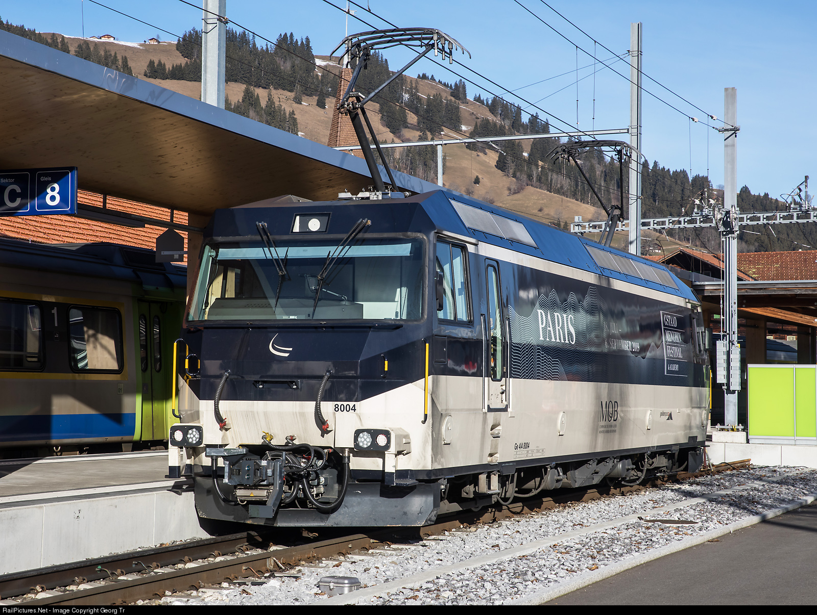 2000 kW meter gauge locomotive Ge 4/4 # 8004 of the MOB (Montreux-Oberland Bernois) in Zweisimmen. The locomotive has now automatic Schwab couplers and a publicity paint scheme for the Gstaad Menuhin Festival.