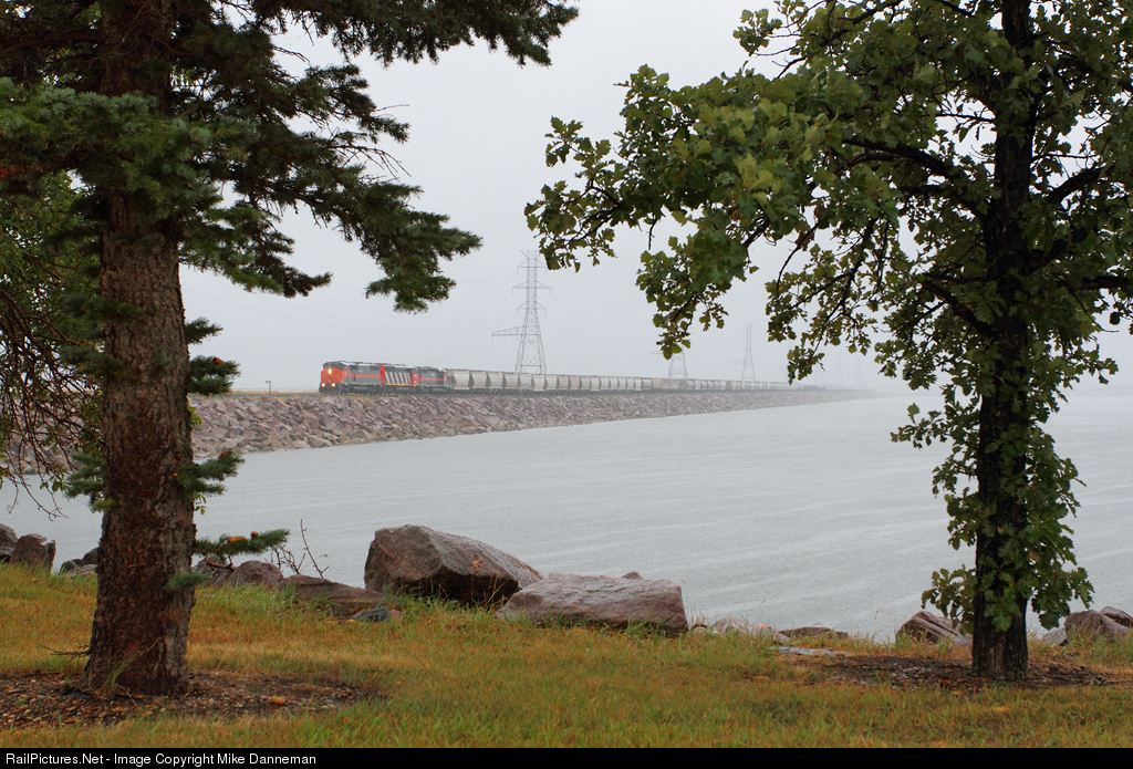 It’s pouring rain on the afternoon of August 27, 2018, as Dakota, Missouri Valley & Western’s “wayfreight” passes milepost 490 between Coleharbor and Garrison, North Dakota, crossing the long causeway separating Lake Sakakawea from Lake Audubon on this section of the Missouri River backed up by the Garrison Dam.
