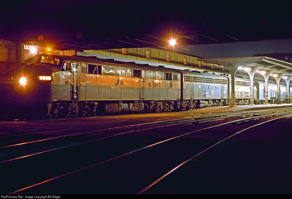The more things change, sometimes the more they stay the same. The scene here is the Burlington Northern Empire Builder waiting impatiently to get on its overnight run from Minneapolis to Fargo and points west. We are a year in to BN, and less than a month away from Amtrak. No SDP40s or SDP45s, the BN leads tonight the way the famed train was originally dieselized back in 1947. With a vintage former GN E7A. By this time BN, MILW and Santa Fe were reassigning modern high horsepower passenger units to freight service to keep them out of the grips of Amtrak. So tonight history repeats itself with a 34 year old E7 leading a pair of F units on Jim Hill's finest train. My understanding is that power changed at Havre, so most likely the E did not have to handle Marias or Stevens Passes.