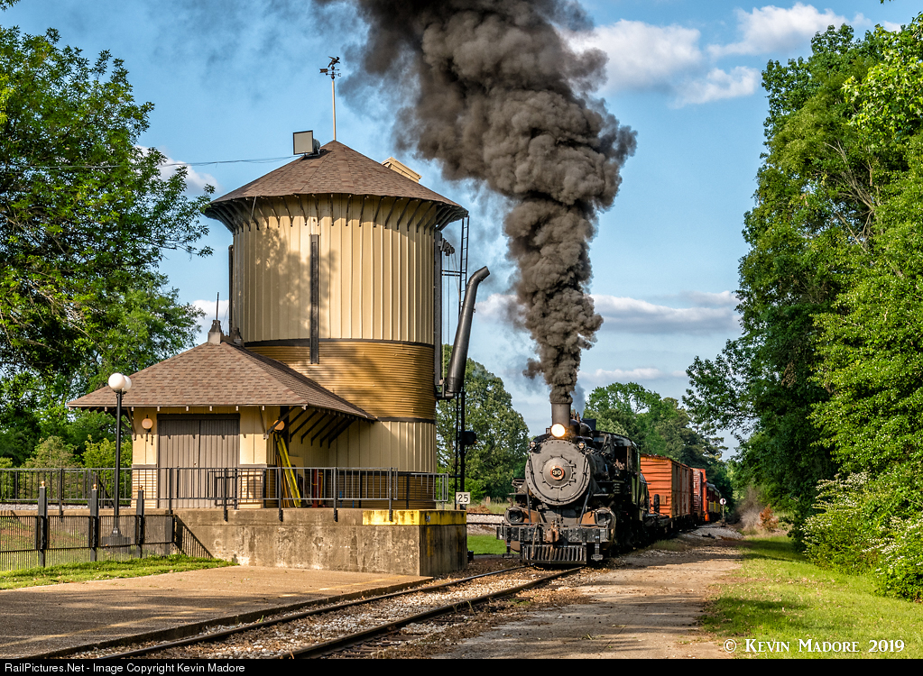 Water at Palestine. With the springtime sun sinking low into the afternoon sky, Tremont & Gulf #30 eases up to the Palestine Water Tank for a welcome drink, after her 25 mile westbound run. Palestine is the western terminus of the present-day Texas State Railroad. This station and yard area features a depot with gift shop, cafe and museum. There is also a large wye and maintenance facility. The popular Texas & Pacific 2-10-4 Locomotive #610 resides in that complex, and is sometimes on display outdoors for folks to photograph and enjoy. Oddly, the ornate water tank you see in this image is not a historic structure, but something built in the tourist era. It definitely has character. I was surprised to learn that it doesn't actually work right now and that some relatively extensive work would be required to get it working. The tank appears to be in beautiful shape. Alas, locomotives are watered elsewhere on the site. It does make an awesome prop for photos however, and is definitely one of the more unique water tanks I have seen as I travel the US photographing preserved steam railroads.
