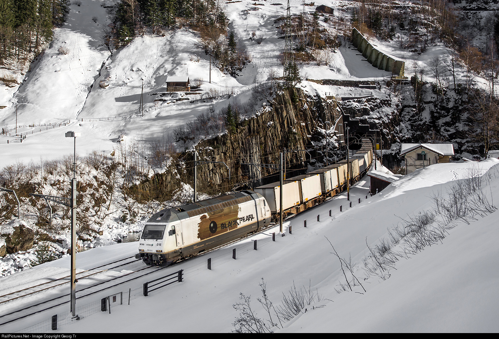 | Re 465 # 016 of the BLS, rented to RailCare and in the special paint scheme "Black Pearl", is pulling train 50512 from Chiasso to Oensingen through the Wattinger curve near Wassen. |
