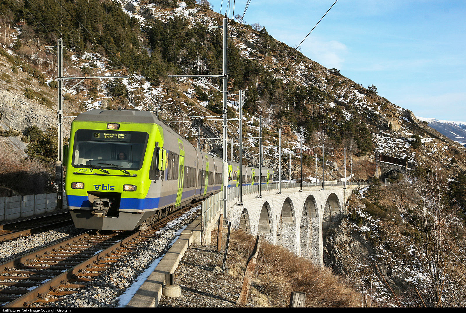 | NINA RABe 525 # 012 and # 011 of the BLS are running the RE 3276 "Lötschberger" from Brig via Goppenstein-Kandersteg-Frutigen-Spiez-Thun to Bern, crossing the Luogelkin viaduct near Hohtenn. |
